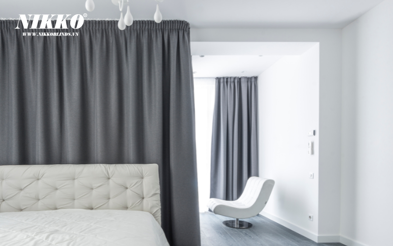 Rèm cửa màu xám là lựa chọn hoàn hảo khi kết hợp với tường trắng, tạo ra sự tương phản đẹp mắt và hiện đại. Màu xám có thể làm nổi bật không gian trắng trong nhà mà không gây ra sự quá tải.